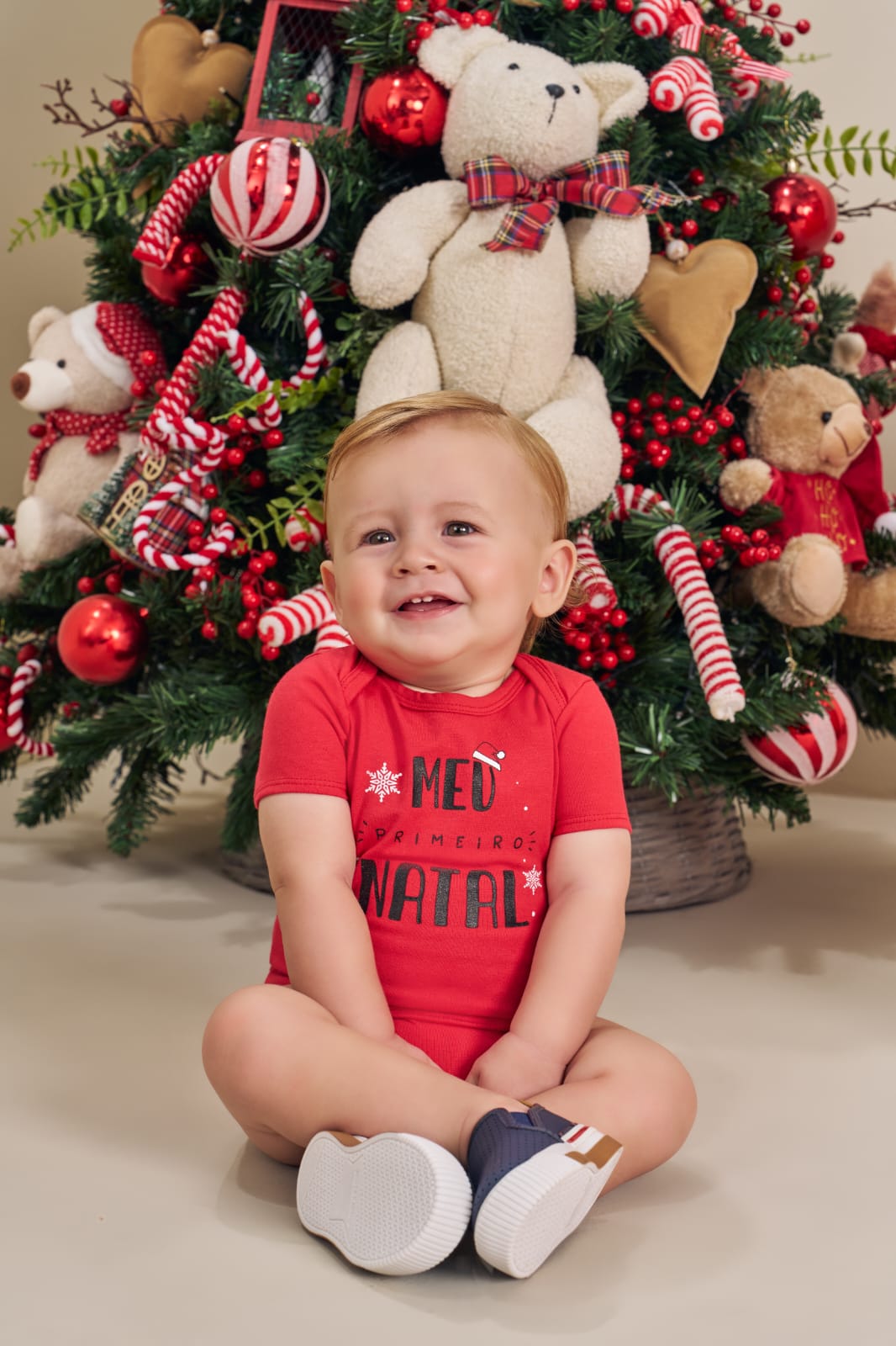 Este é um body de bebê na cor vermelha, ideal para celebrar o primeiro Natal do seu pequeno. A peça, de manga curta, possui a estampa “MEU PRIMEIRO NATAL” em preto e detalhes de flocos de neve e estrelas, também em branco.
