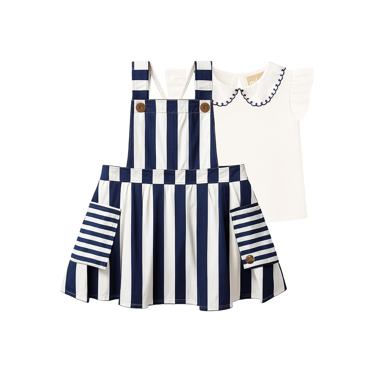 Acompanha uma blusa branca de manga curta em tecido macio, com uma clássica gola boneca bordada em linha rosa para um visual refinado.