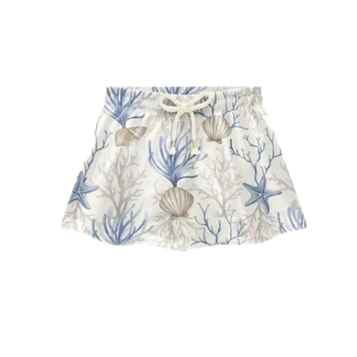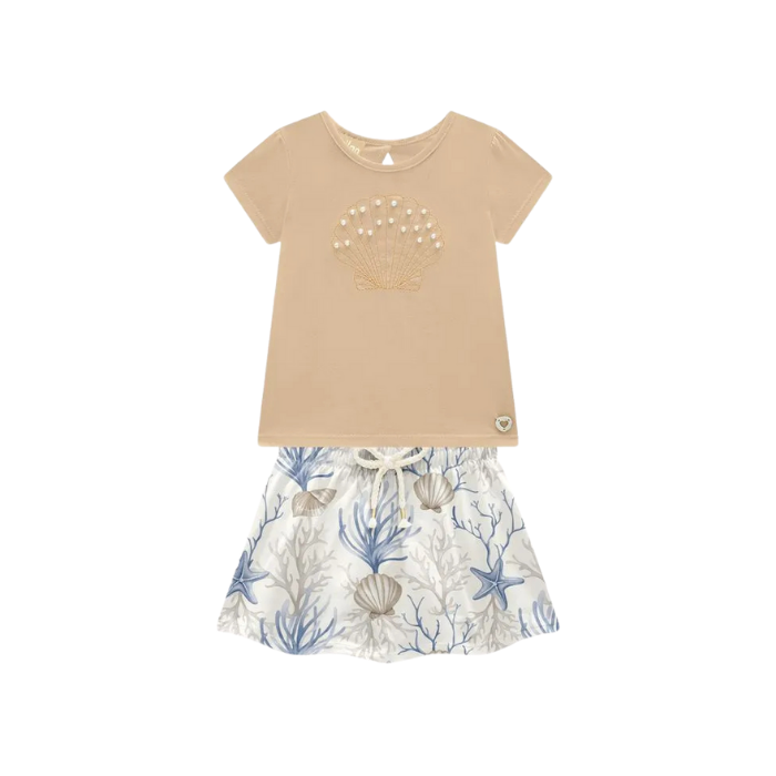 A saia, também em Cotton, traz estampa do fundo do mar e cintura com elástico rebatido, além de cadarço em laço e barra com bainha. Inclui short interno para conforto.