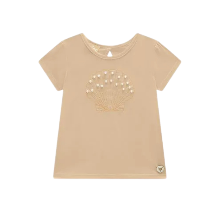 A blusa, em Cotton, 95% algodão e 5% elastano, apresenta cor lisa com bordado em lurex de concha e apliques de pérolas, conferindo sofisticação.
