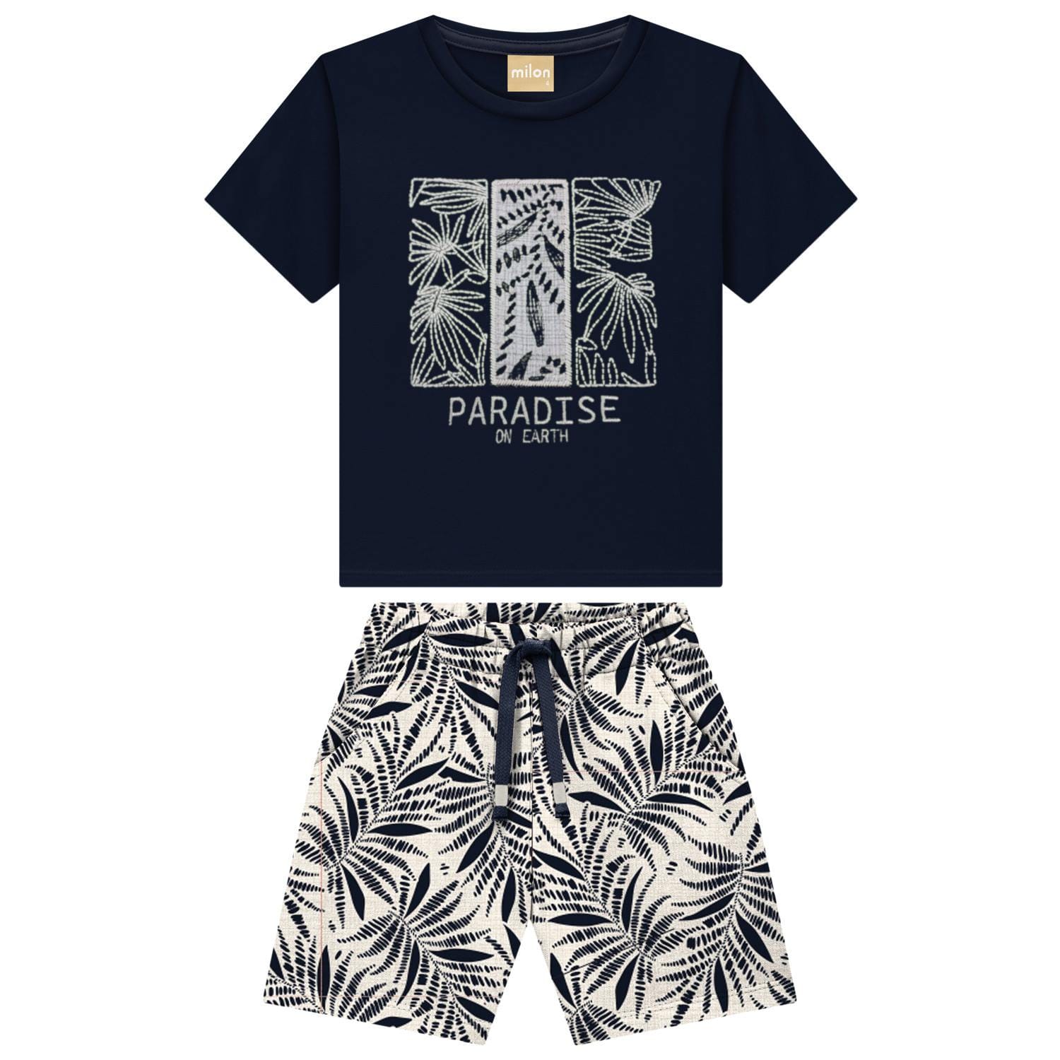 A camisa é confeccionada em tecido macio e leve, como 100% algodão, para proporcionar respirabilidade e conforto. A cor azul-marinho destaca a estampa de palmeiras e a frase “PARADISE ON EARTH”, trazendo um clima tropical e descontraído.