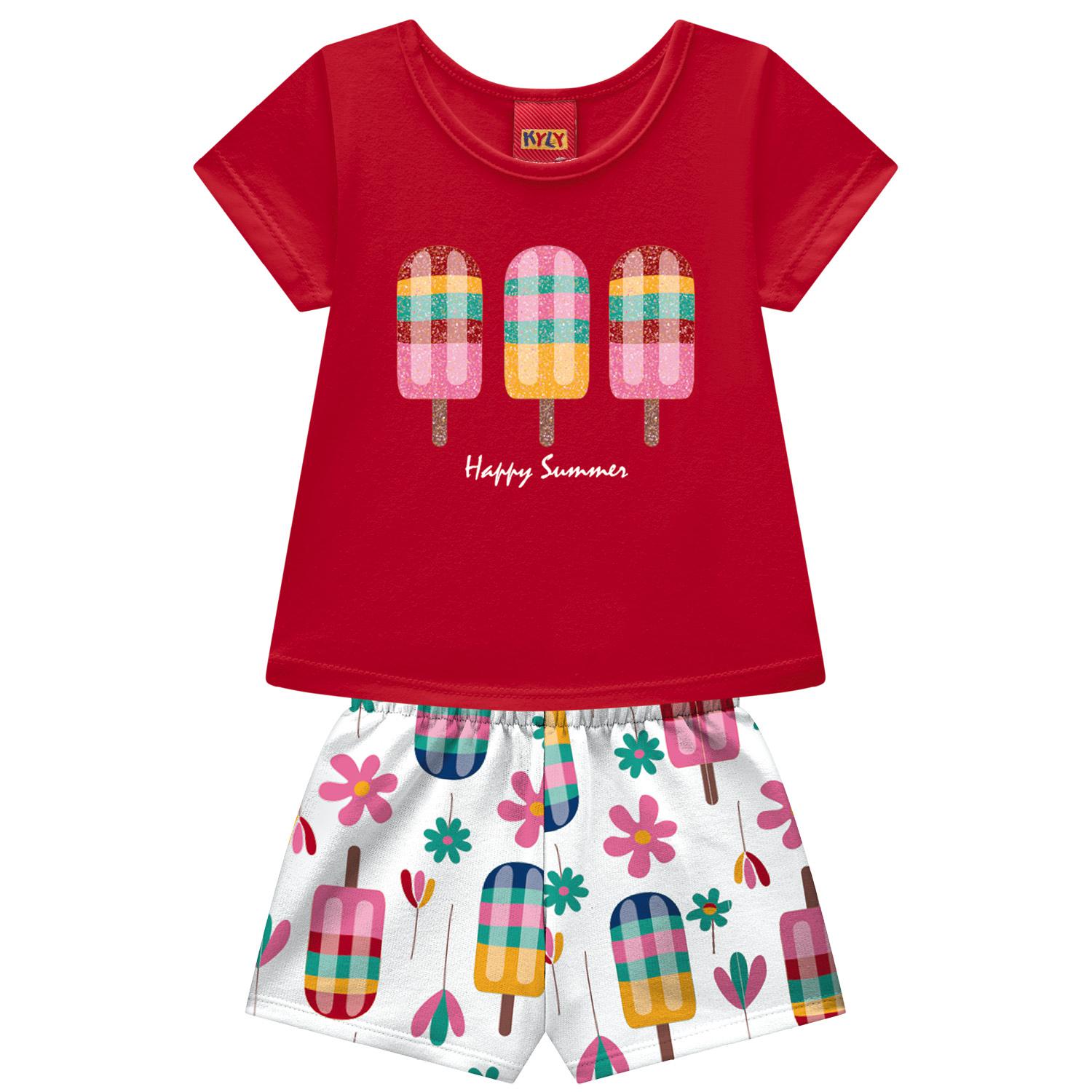 Blusa vermelha de manga curta com gola redonda. Apresenta uma estampa frontal de três picolés coloridos em padrão xadrez e a inscrição “Happy Summer” (Verão Feliz) logo abaixo.