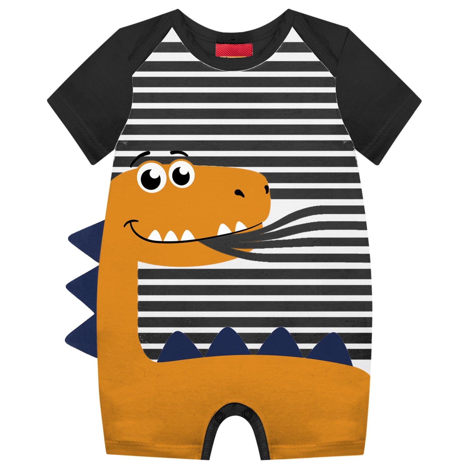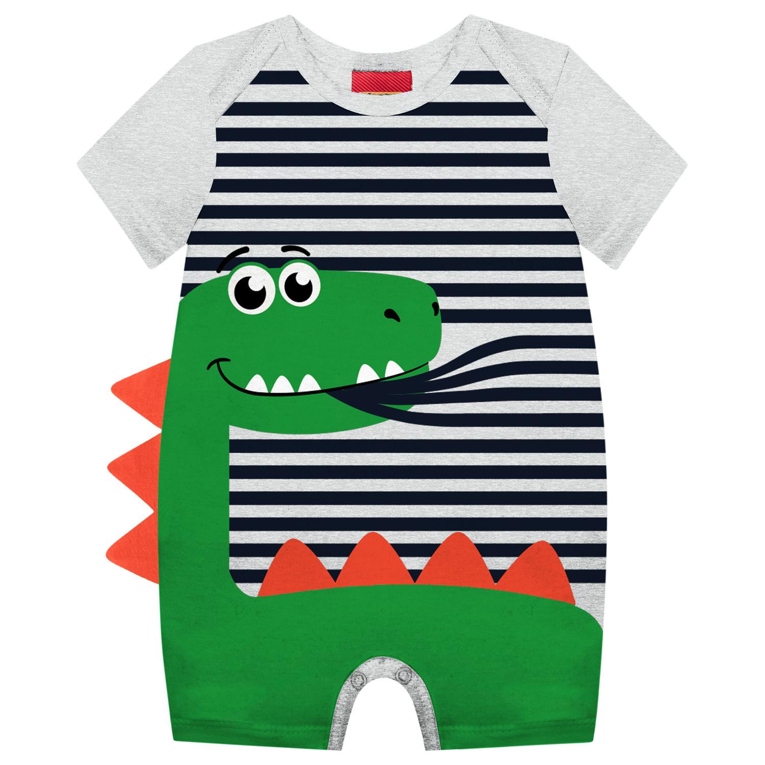 O romper apresenta uma estampa de listras horizontais em azul marinho e branco na parte superior do corpo. As mangas são cinza mescla. Na parte frontal, há uma grande estampa de um dinossauro verde com detalhes em laranja nas costas e na língua.