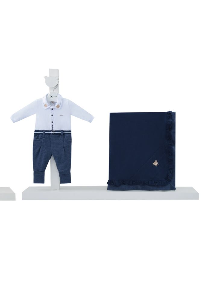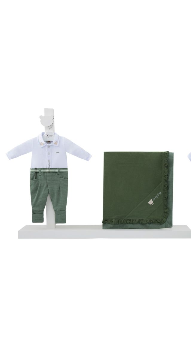 Este conjunto em particular é composto por um macacão e uma manta, ideal para proporcionar conforto e aconchego ao recém-nascido.