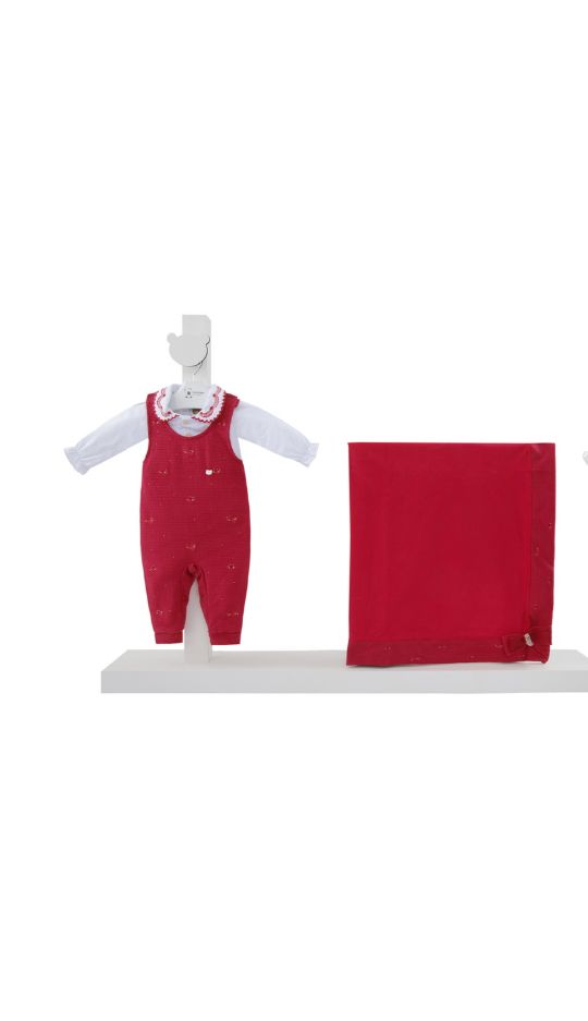 Uma manta na mesma cor vermelha, confeccionada em material suave, perfeita para envolver o recém-nascido e mantê-lo aquecido durante a saída da maternidade e nos passeios.