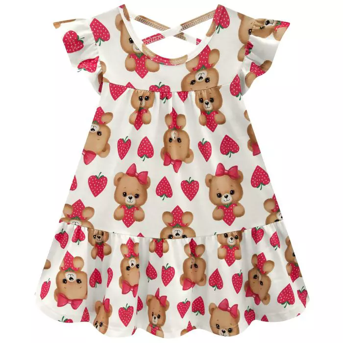 A estampa exclusiva de ursinhos fofos e moranguinhos suculentos cria um visual lúdico e charmoso, ideal para festas, passeios ou para um dia de diversão em casa.